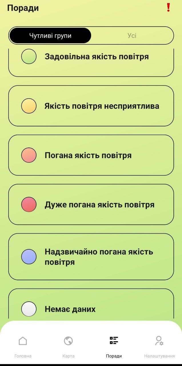 Можно отслеживать ситуацию рядом или смотреть общую картину по городу. Зеленые кружочки – все ок, желтые – есть проблемы, красные – плохое качество, синие – аномальные показатели. Кроме того, создатели приложения оставили советы для каждого из этих состояний.