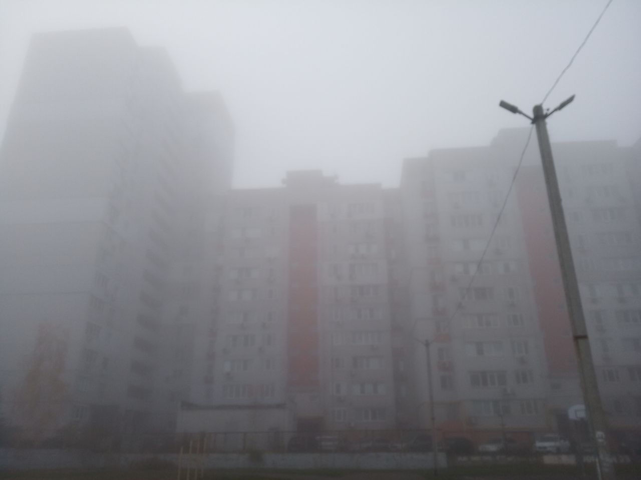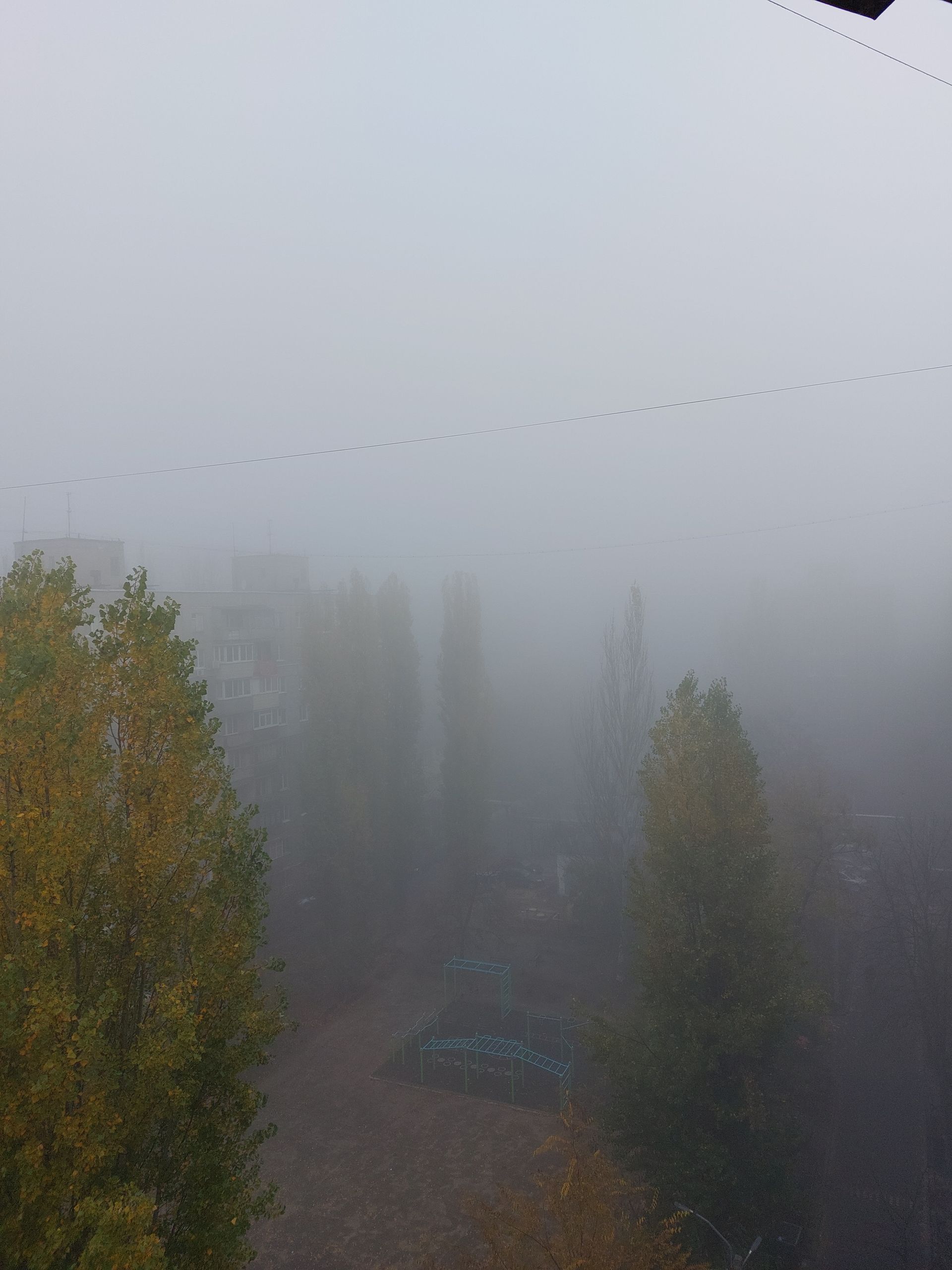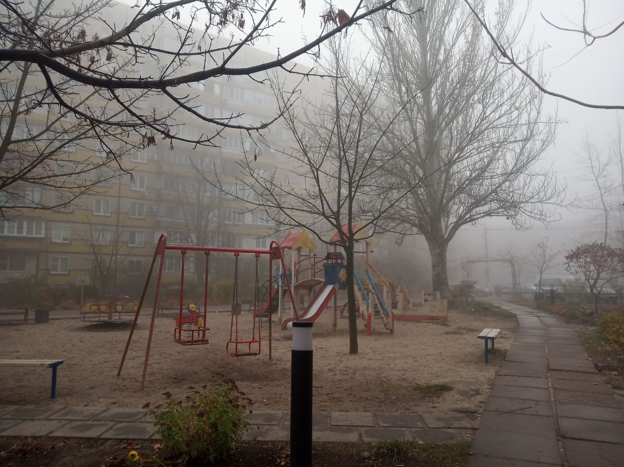 Местами туман настолько густой, что соседние многоэтажки полностью скрываются в нем. Детские площадки превратились в места для съемки фильмов ужаса.
