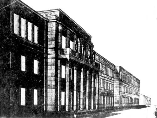 Он предложил расширить корпус вдоль улицы и надстроить еще один этаж. А у главного входа сделать портик с шестью квадратными колоннами. Фасад планировалось облицевать натуральным камнем. Но от этого вскоре пришлось отказаться из-за нехватки денег. Камень заменили обычной штукатуркой.