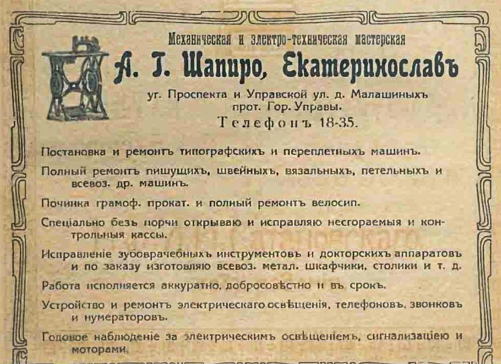 Также в Екатеринославе 100 лет назад различные мастера рекламировали свои услуги. Вместо досок объявлений в интернете и социальных сетях использовали газеты.