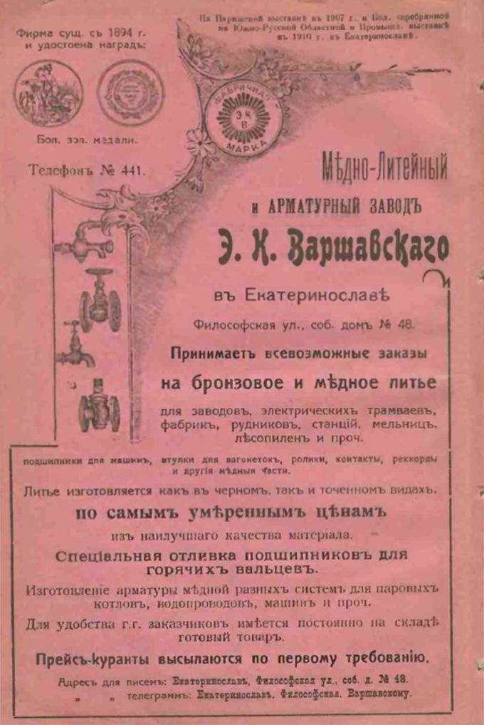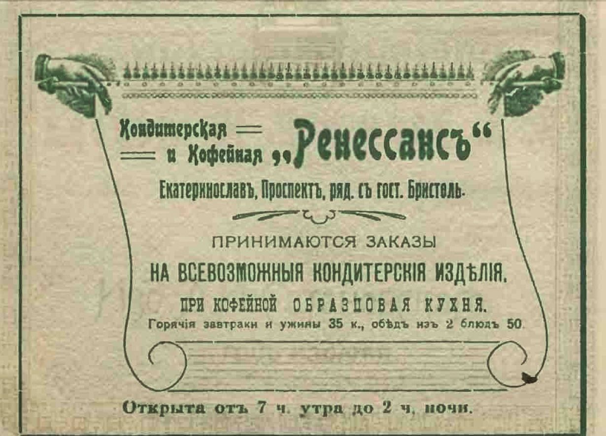 Во времена Екатеринослава реклама размещалась в газетах и на досках у самих магазинов, тем самым сообщая потенциальному покупателю, что можно купить в этой торговой лавке.
