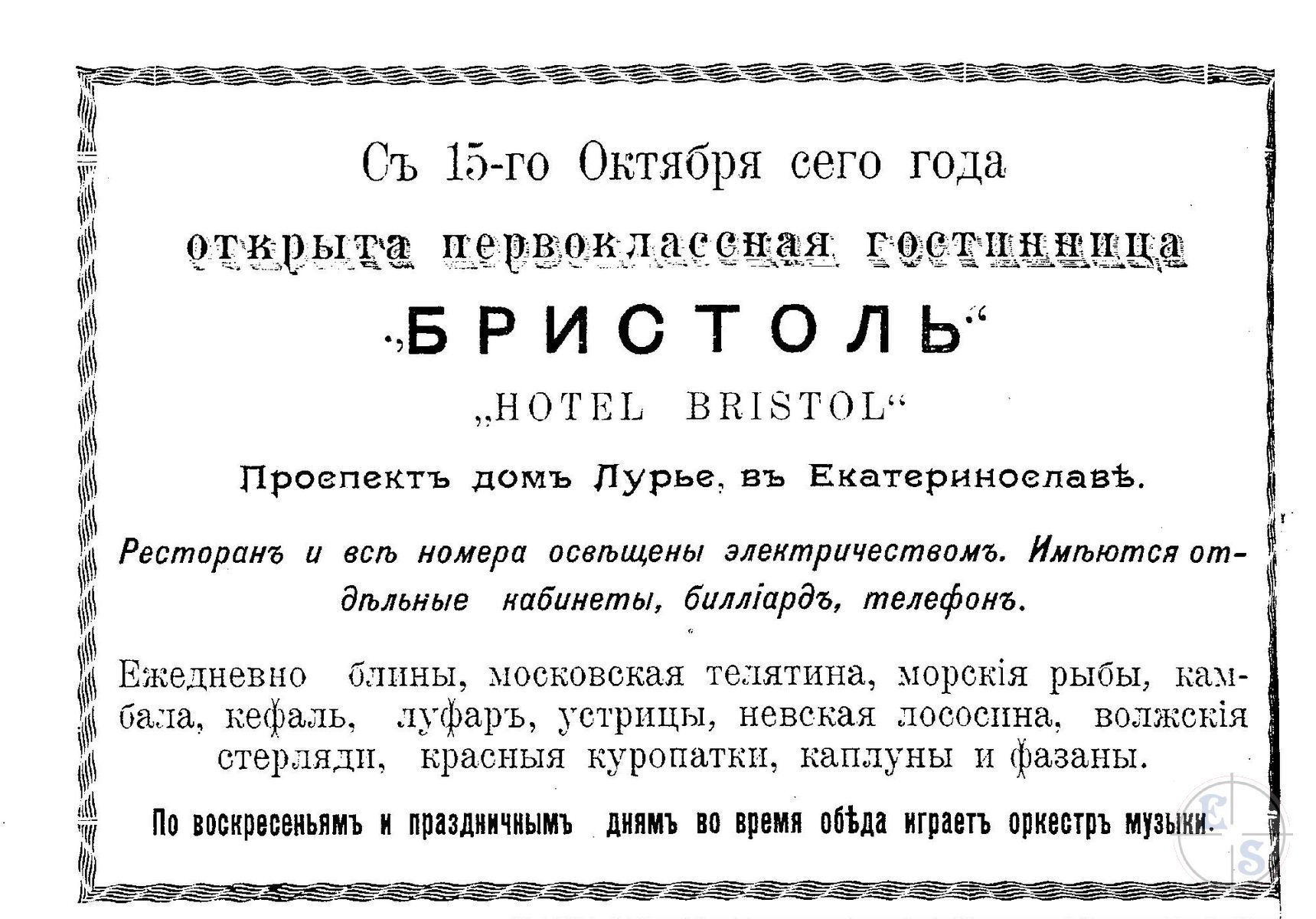 Трехэтажная гостиница «Бристоль» открылась в Екатеринославе в 1899 году. Отель размещался по соседству с гостиницей «Пальмира», находился на центральном проспекте, а участок, на котором находился «Бристоль» принадлежал Герцу Лурье.