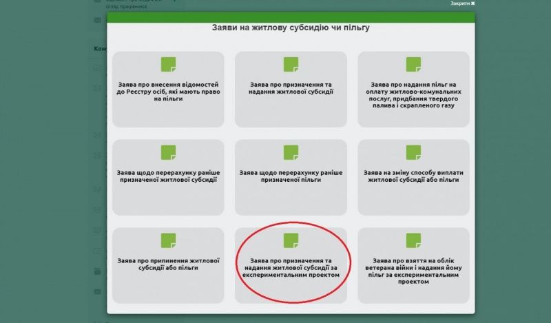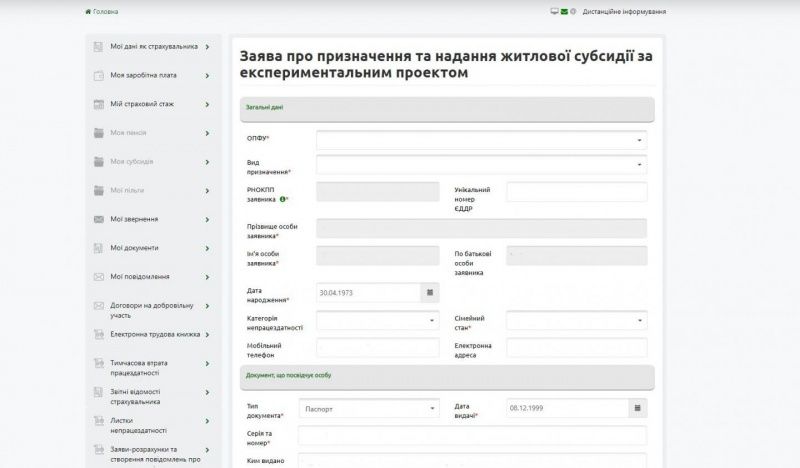 На портале необходимо выбрать опцию «Заявление о назначении и предоставлении жилищной субсидии по экспериментальному проекту». Далее следует заполнить онлайн-форму.