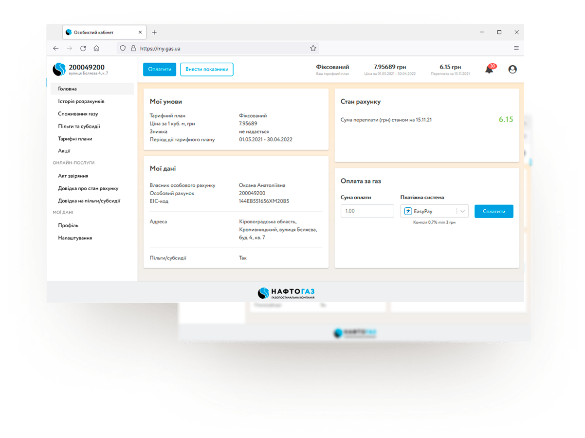 Узнать о состоянии своего счета, долга, оплатить за потребленный газ и передать показания счетчика можно в личном кабинете на профильном сайте поставщика.