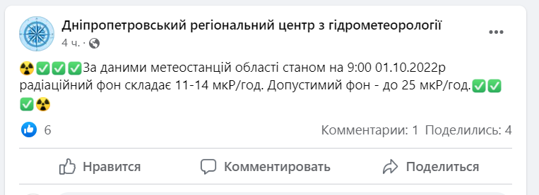 В Днепропетровской области по состоянию на 1 октября радиационный фон составляет 11-14 мкР/час.