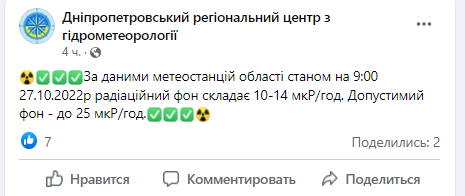 В Днепре и Днепропетровской области по состоянию на 27 октября радиационный фон составляет 10-14 мкР/час. То есть все в норме!