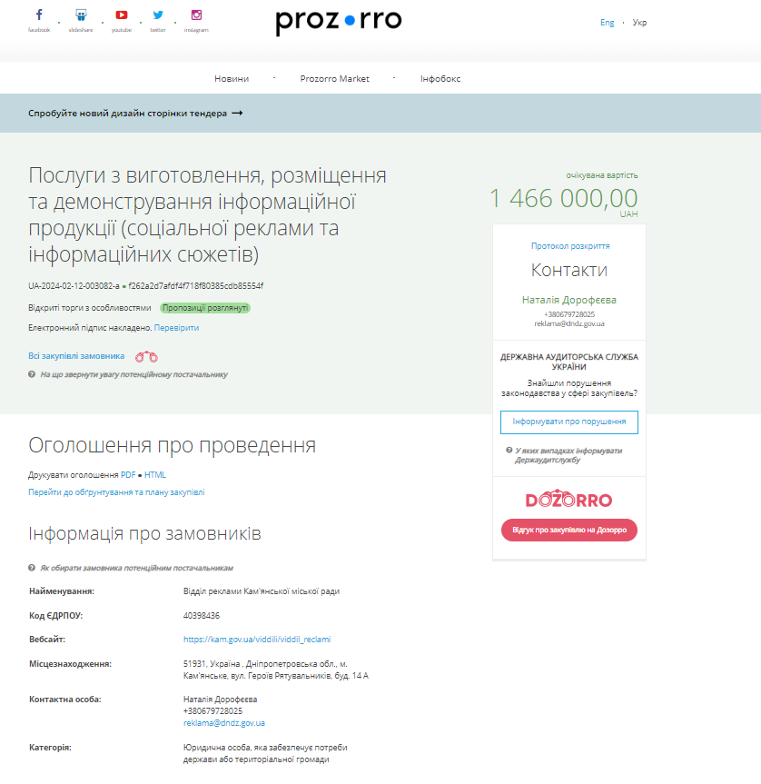 А отдел рекламы Каменского городского совета хочет закупить "услуги по изготовлению, размещению и демонстрации информационной продукции (социальной рекламы и информационных сюжетов)" на сумму 1 466 000 грн. Тендер также был опубликован на Prozorro в феврале. Срок подачи предложений закончился 21 февраля 2024 года.