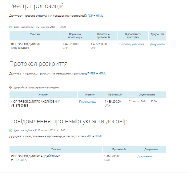 Здесь также был только один участник - ФЛП "РЯБОВ ДМИТРИЙ АНДРЕЕВИЧ", который предлагает предоставить данные услуги за 1 465 200 грн.