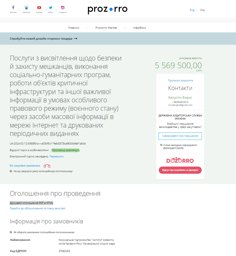 Так, коммунальное предприятие "Институт развития города Кривого Рога" Криворожского городского совета планирует закупить "услуги по освещению безопасности и защиты жителей, выполнения социально-гуманитарных программ, работы объектов критической инфраструктуры и другой важной информации в условиях особого правового режима (военного положения) через средства массовой информации в сети Интернет и печатных периодических изданиях" на сумму 5 569 500 грн. Соответствующий тендер появился на сайте Prozorro 12 февраля 2024-го. Прием предложений продолжался до 20 февраля 2024 года.