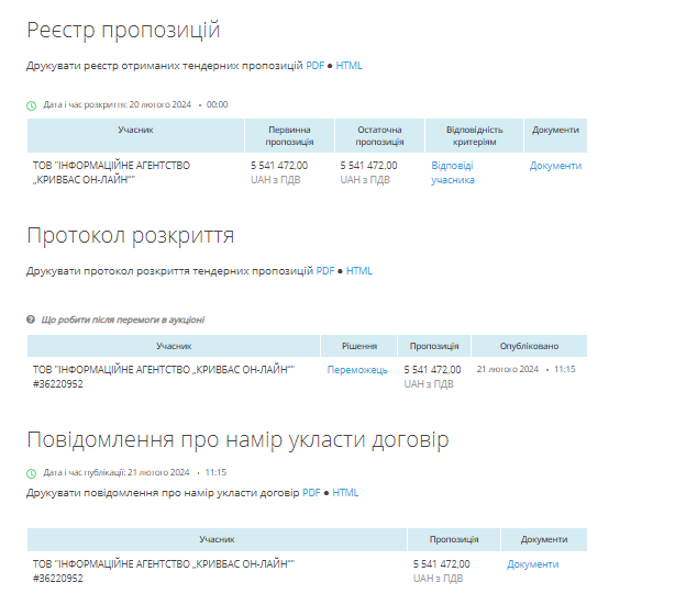 Как можно увидеть, был всего один участник - ООО "Информационное агентство "КРИВБАС ОН-ЛАЙН". Он даже предложил немного меньшую цену за свои услуги - 5 541 472 грн.