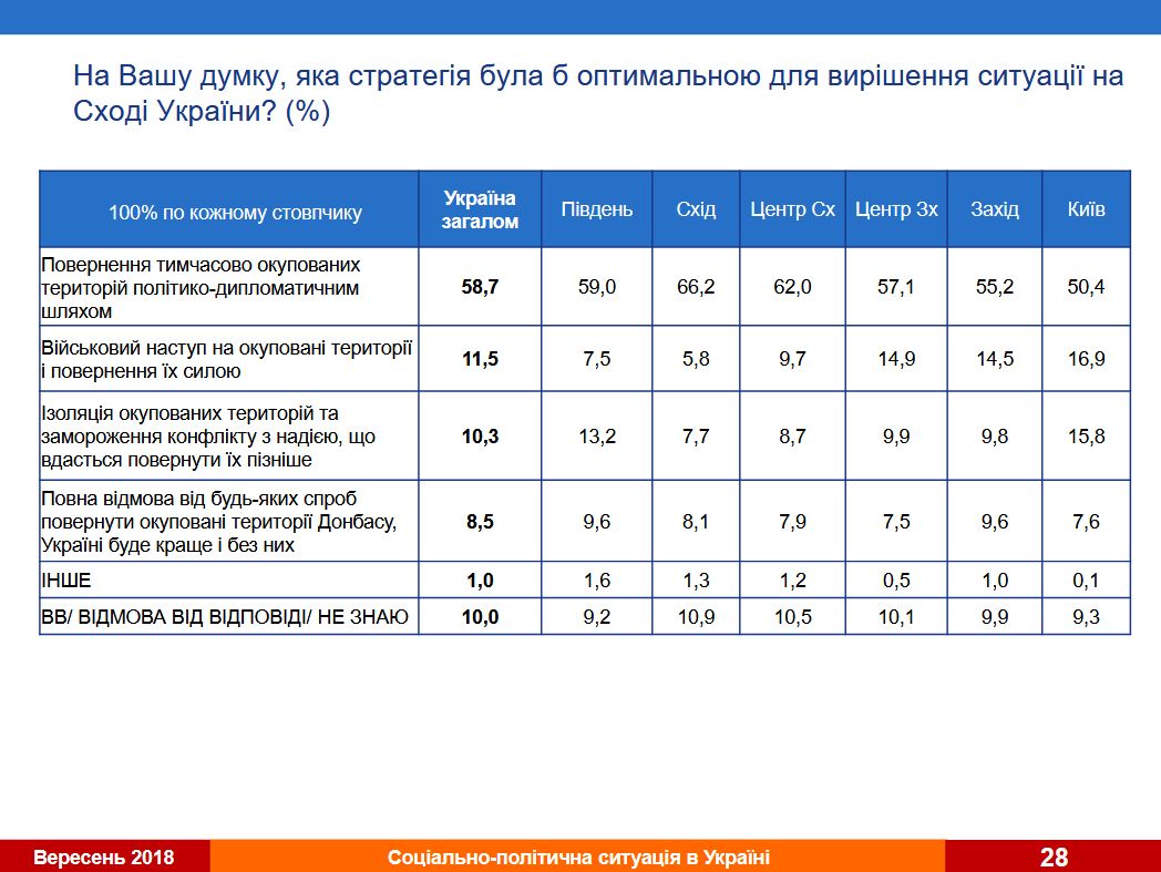 На вопрос, какая стратегия была бы оптимальной для решения ситуации на Востоке Украины, почти 59% опрошенных украинцев выбрали дипломатический путь возвращения оккупированных территорий.