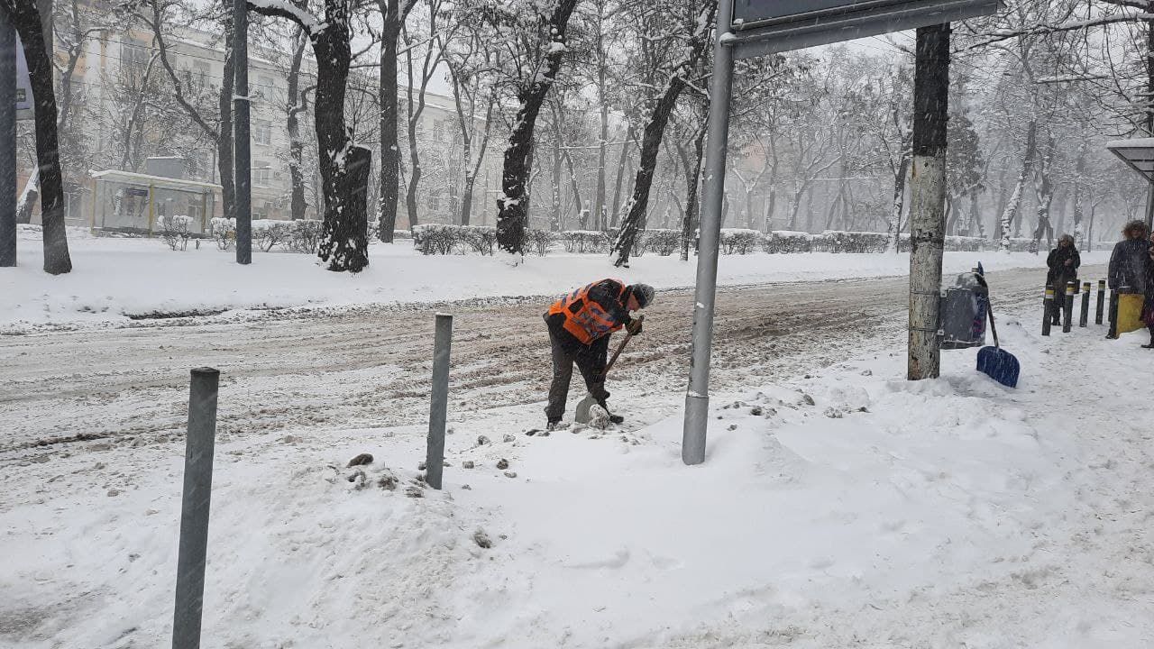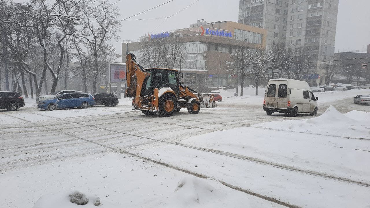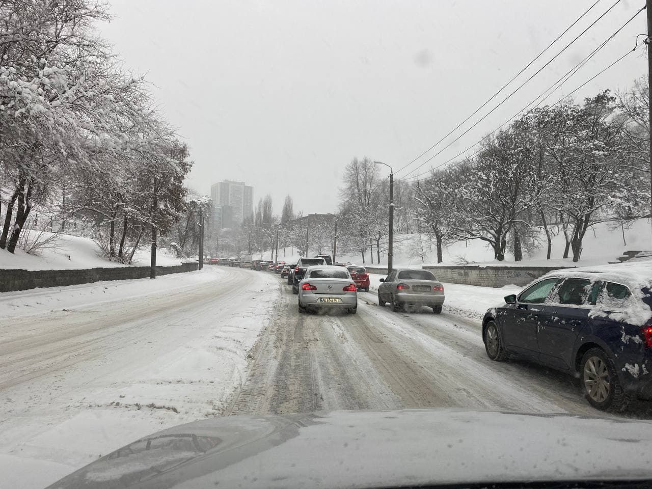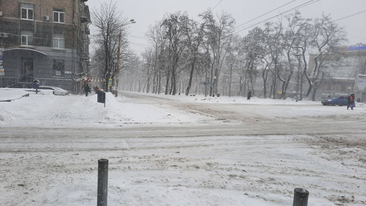Утро в Днепре началось со сильного снегопада. Улицы города практически не проездные.