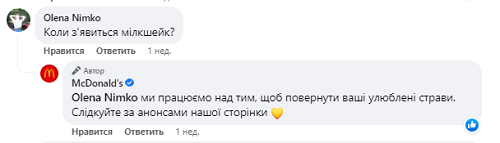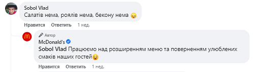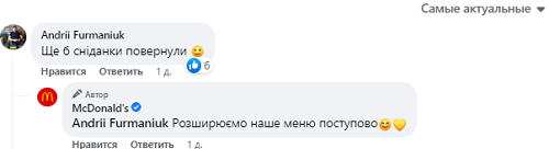 «Работы ресторанов мы возобновляем соответственно с поэтапным планом. Следите за актуальной информацией на наших официальных страницах», - так прес-служба McDonald's ответчает пользователям Facebook на вопрос, когда сеть снова заработает в Днепре.
