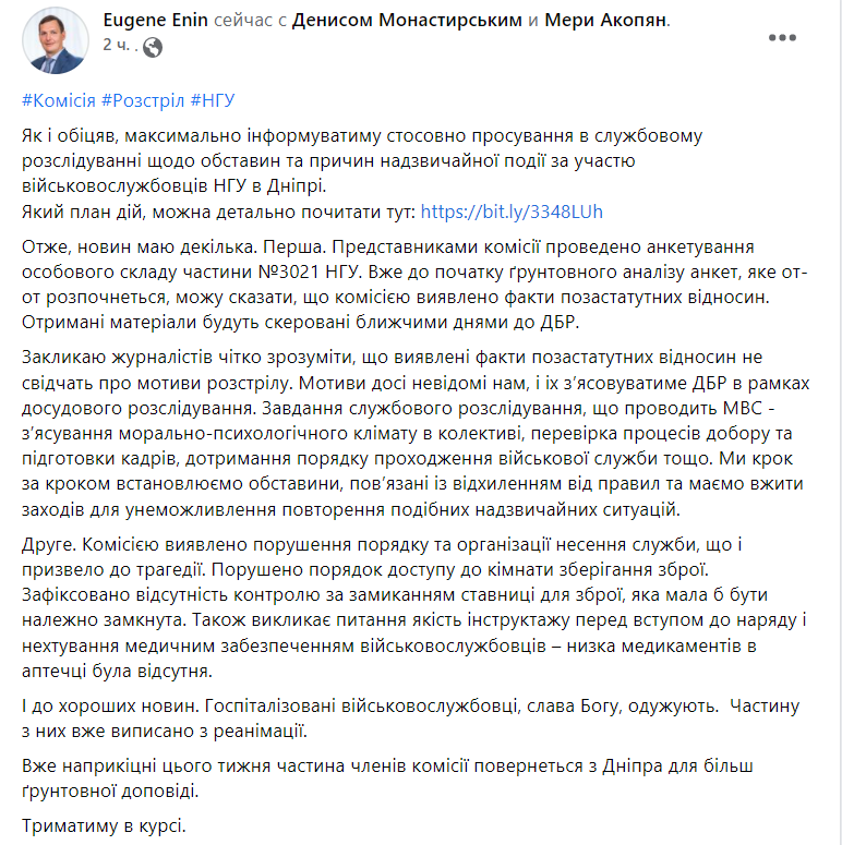 По его словам, специальная комиссия, которую собрали, чтобы проверить часть, где нацгвардеец Рябчук устроил стрельбу, выявила нарушения. В частности, они касались неуставных отношений между военнослужащими. Правда, замминистра отметил, что они не касаются мотивов именно этой трагедии.