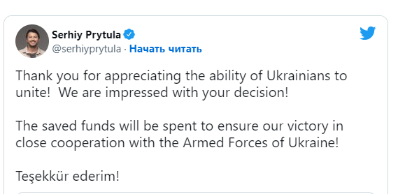 При этом Сергей Притула отметил, что сэкономленные средства (а это 600 млн грн), которые собирали на три турецких Bayrаktar TB2, пойдут на обеспечение победы Украины.