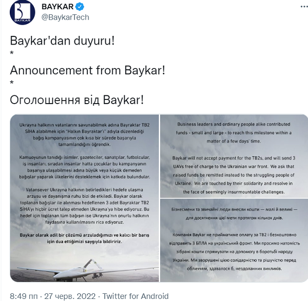"Компания Baykar осведомлена, что кампания по сбору средств под названием "Народный Bayraktar" успешно собрала сумму для приобретения нескольких БПЛА Bayraktar ТВ2 для украинцев для защиты своей Родины", - говорится в сообщении.