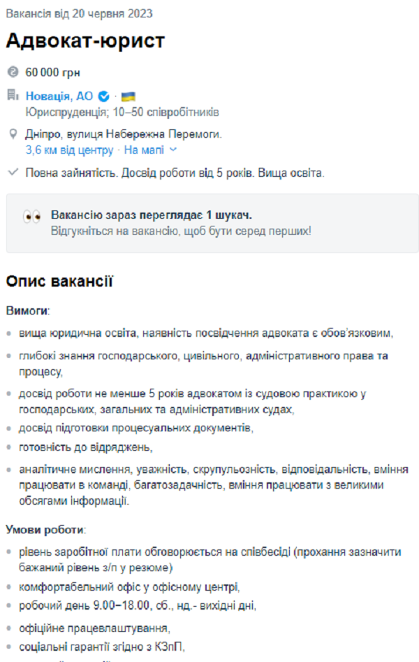 Адвокат-юрист в Днепре может заработать 60 тыс грн. Тем, кто хочет устроиться ну эту должность нужно иметь не менее 5 лет опыта работы адвокатом, быть готовым к командировкам, хорошо знать хозяйственное, цивильное и административное право, иметь работать в команде. Нужно будет представлять интересы физических и юридических лиц во всех судовых инстанциях и подготавливать процессуальные документы.