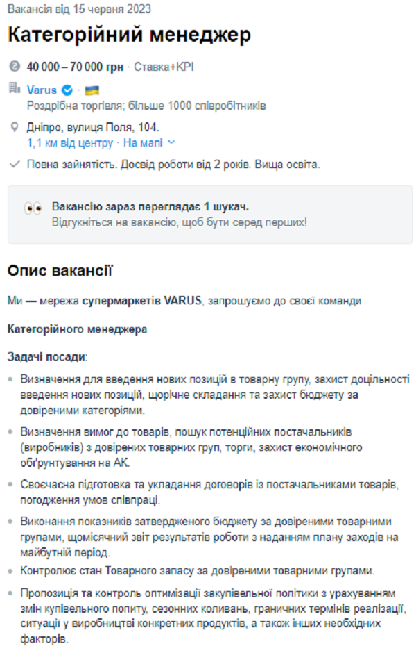 Чуть меньше – от 40 до 70 тыс грн в месяц может заработать категорийный менеджер сети супермаркетов. Ему нужно будет подписывать договоры с поставщиками, искать потенциальных поставщиков, контролировать состояние товарного запаса, оптимизировать закупочную политики и контролировать цену, а также разрабатывать статегию повышения показателей продажи товара.