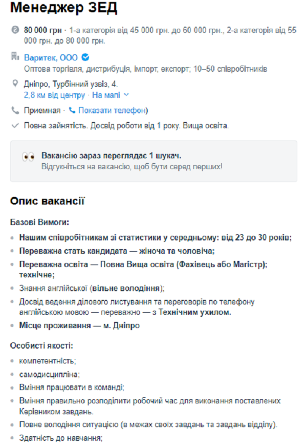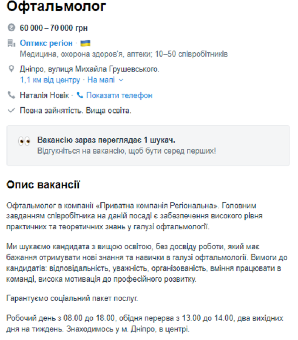 Офтальмолог в Днепре может зарабатывать от 60 до 70 тыс грн в месяц. Чем конкретно должен будет заниматься врач на должности не сказано. Отмечается, что он должен будет «обеспечивать высокий уровень практических и теоретических знаний в офтальмологии», а еще он должен быть ответственный, организованный и мотивированный. Рабочий день предполагается с 8 утра до 18 вечера.