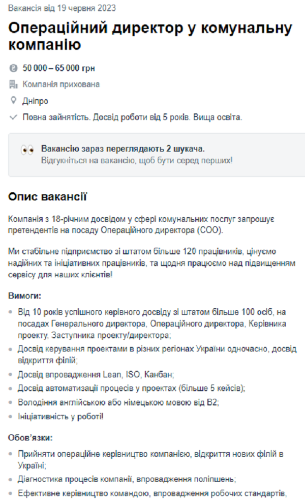 Операционный директор коммунальной компании может заработать от 50 до 65 тыс грн. Претендент должен иметь опыт работы от 5 -10 лет, знать английский и немецкий языки. На должности ему нужно будет открывать новые филии по стране, эффективно руководить подчиненными и выполнять показатели KPI, определять план развития компании.