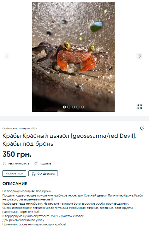 Завести дома краба «породі» «Красный дьявол» обойдется в 350 грн за штучку. Пресноводное не большого размера – около 2-3 см, в уходе не прихотливое – ест фрукты, насекомых и корм для рыб. Любит не только воду, но и сушу. Родина краба – остров Ява. Продолжительность жизни составляет 2-3 года.