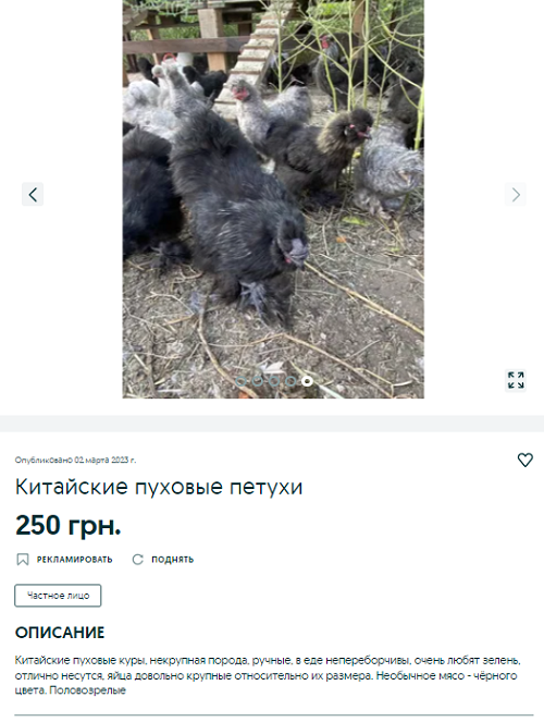 Те, кто живет в частном доме могут завести в качестве питомца китайских пуховых кур или петухов. Цена одной особи – 250 грн. Как отметил автор объявления, птица очень любит зелень и хорошо несется. А еще у них необычное мясо черного цвета, оно считается дорогим деликатесом. Да и сами куры выглядят весьма необычно.