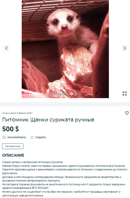 За 18,3 тыс грн в Днепре можно купить щенков суриката. Автор объявления утверждает, что звери чипированные, питомник, где их разводят – официально зарегистрирован, а новому владельцу суриката выдадут не только паспорт зверька, но и его свидетельство о рождении.