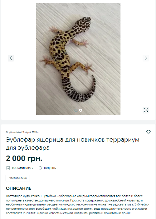 Ящерицу эублефара можно купить в Днепре за 2 тыс грн. Владелец геккона отмечает, что содержать пресмыкающегося просто, от него нет неприятного запаха, они не вызывают аллергии. Длина взрослой особи может достигать 10 см, а вес – 50 грам. Живут эублефары до 15 лет. Отличительной их чертой является строение челюсти, из-за чего кажется, что ящерица постоянно улыбается.