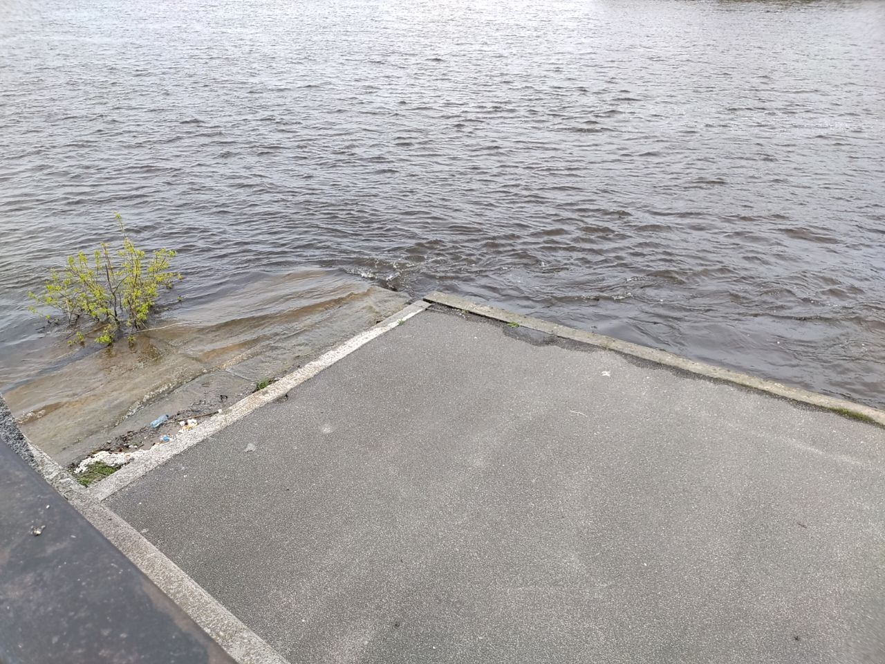 Проходя вдоль набережной можно увидеть, как увеличился уровень воды в реке.