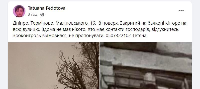 Днепр. Срочно. Малиновского, 16. 8 этаж. Закрытый на балконе кот орет на всю улицу. Дома нет никого. Имеющий контакты хозяев, отзывайтесь. Зооконтроль отказался не предлагать. 0507322102 Татьяна, – отметила женщина.