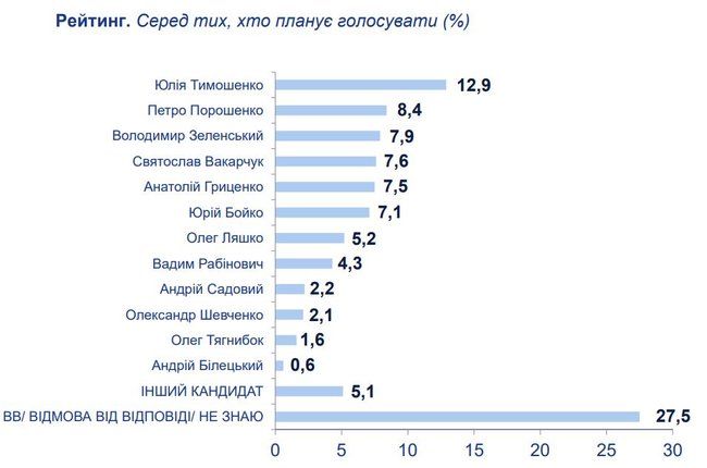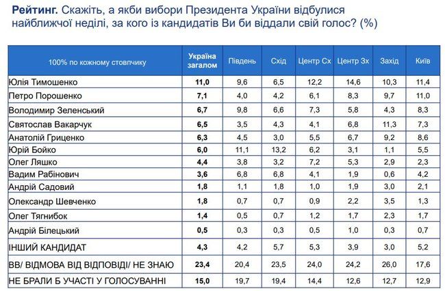 Если бы выборы президента состоялись на этих выходных, то Юлия Тимошенко получила бы 11% голосов, Петр Порошенко - 7,1%, Владимир Зеленский - 6,7%, Святослав Вакарчук - 6,5%, Анатолий Гриценко - 6,3%, Юрий Бойко - 6%, Олег Ляшко - 4,4%, Вадим Рабинович - 3,6%. Остальные кандидаты не дотянули бы и до отметки в 2%.