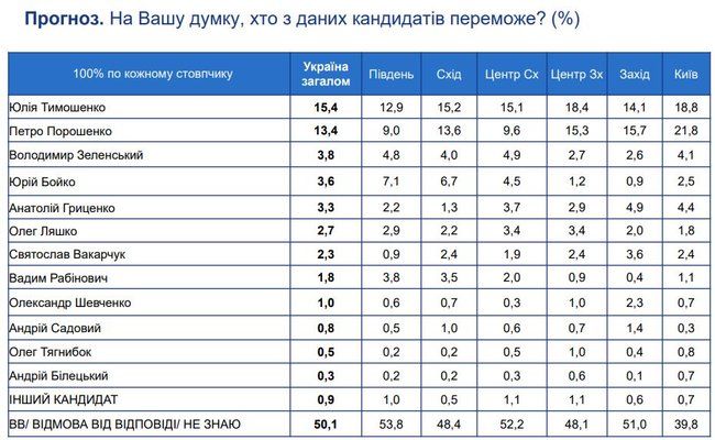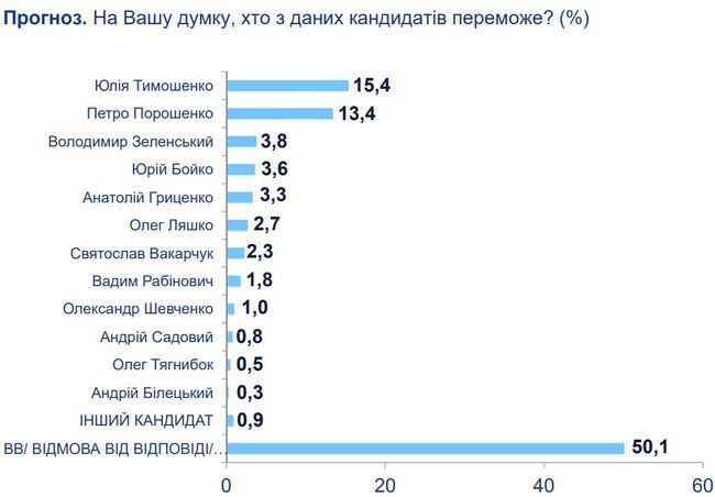 А вот на вопрос, кто из кандидатов победит, ответ отличался. Юлия Тимошенко (15,4%) и Петр Порошенко (13,4%) значительно оторвались от всех остальных. Никто из преследователей не набрал и 4%, что правда 50% опрошенных отказались отвечать на этот вопрос.