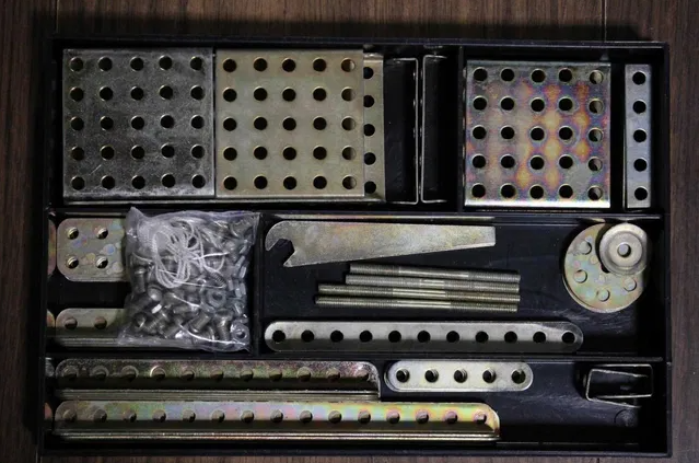 Выпускали и детский конструктор. Железный «аналог» «Лего». Сам конструктор – это набор перфорированных «плиток», гаечных ключей, различных болтиков-шурупчиков, ключей и инструкция, что из этого конструктора можно сделать.