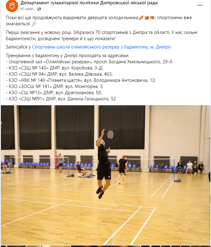 Кроме того, Днепровская специализированная детско-юношеская спортивная школа олимпийского резерва по бадминтону имени Вавилова приглашает в свою команду юных жителей Днепра.