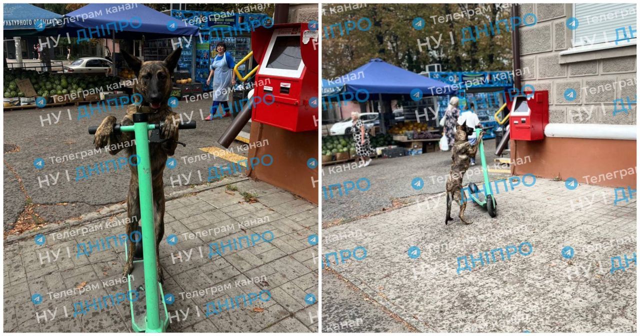 Жители Днепра стали свидетелями необычного перфоманса. На обычном зеленом самокате посреди улицы стояла большая собака.