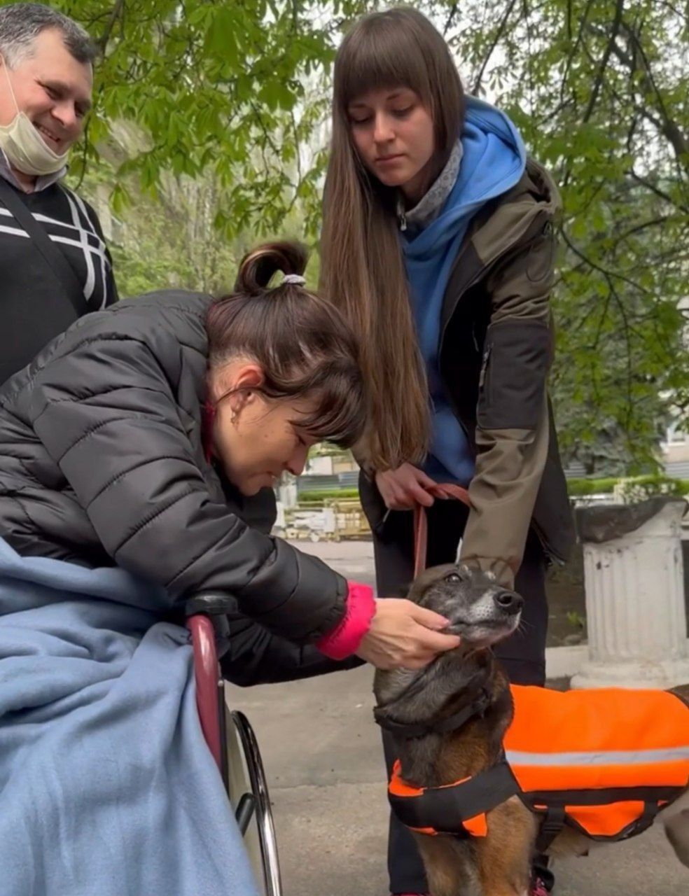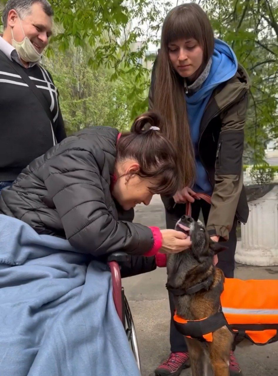 Едва ли не впервые, она вышла на улицу после ранения, где встретилась с одним из своих любимцев - собакой Спарки. Животное - аттестованая собака-терапевт, поэтому знает как вести себя рядом с людьми, получившими травмы. А вот других воспитанников - Мишку и Бешу, в кинологине пока не пускають, потому что они не будут знать, как правильно себя вести.