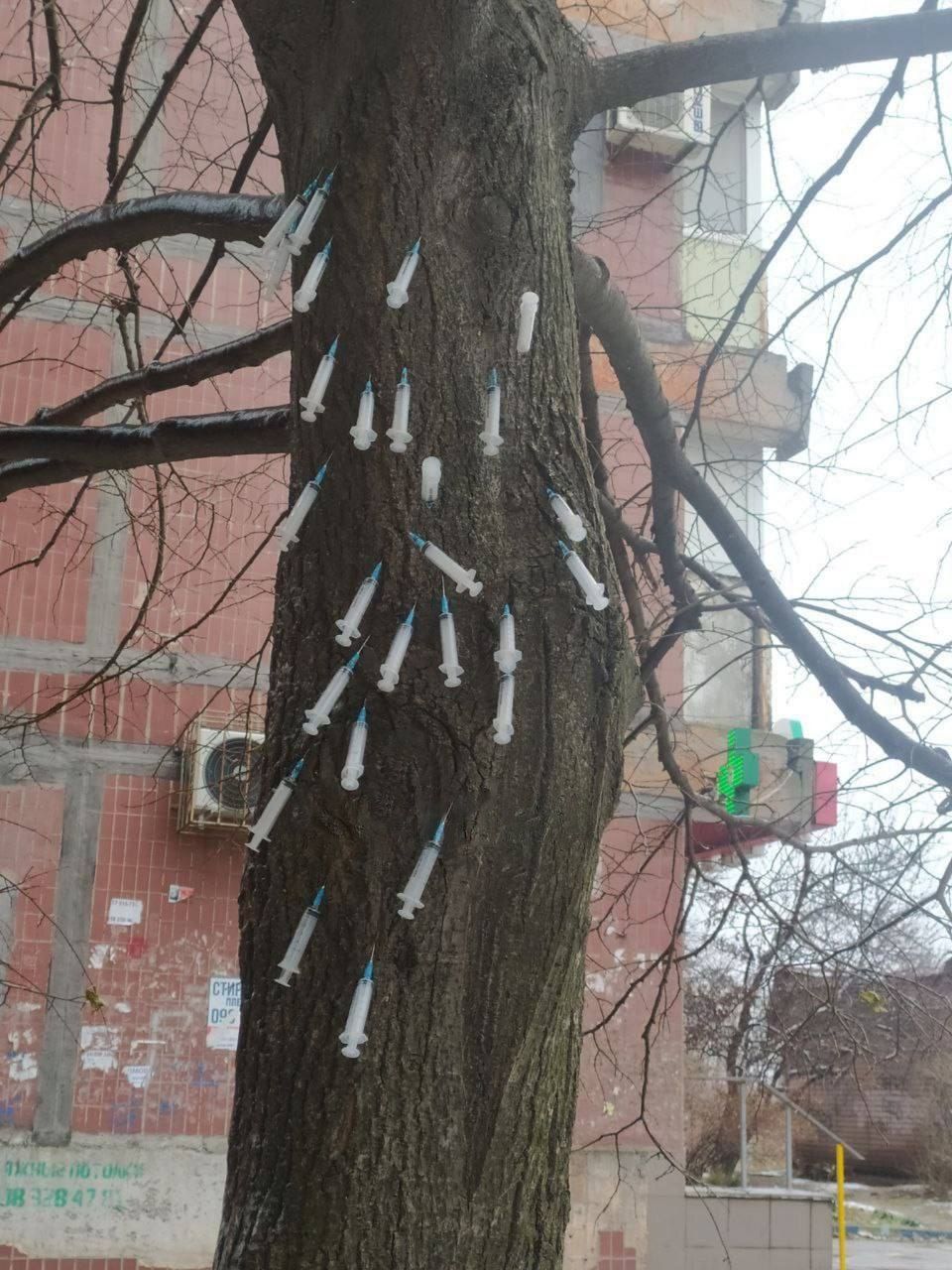 Неизвестно, использовали ли для арт-инсталляции новые или использованные шприцы. Горожане предположили, что кто-то хотел полечить дерево или действительно таким образом проявил свой художественный талант.