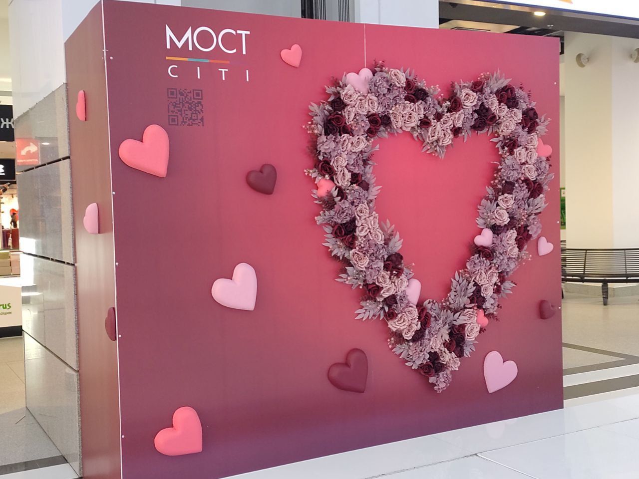 В ТЦ «Мост Сити» нет тематической фотозоны, но есть баннер, где выложено огромное сердце из цветов. Сделать селфи или фото рядом с ним не получится – он стоит у фонтана, но к нему можно подойти довольно близко и сделать фото на его фоне.