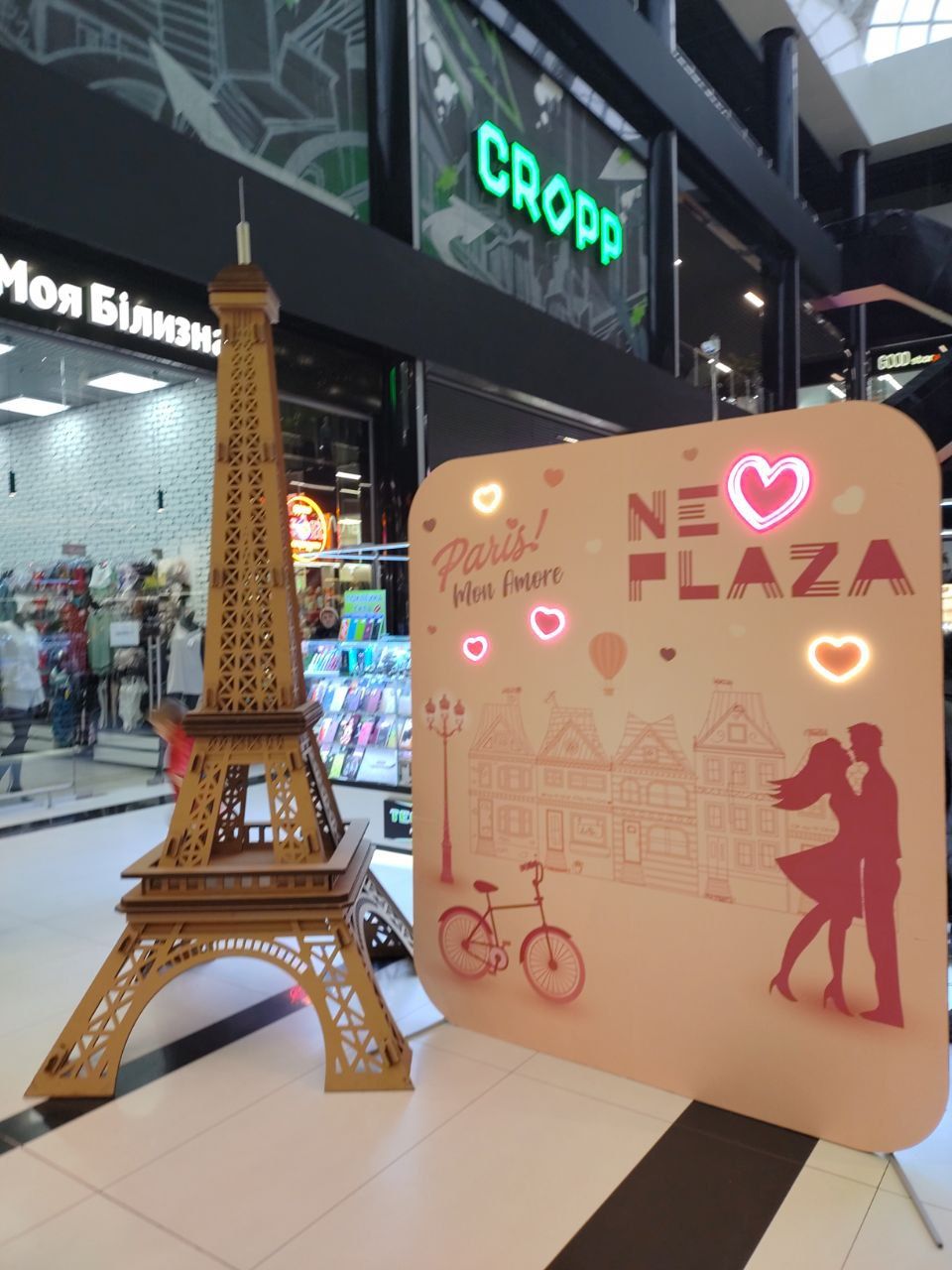 Уголок Франции можно найти в ТЦ Neo Plaza. Тут есть небольшой макет Эйфелевой башни и баннер, создающий иллюзию французской улочки. На баннере есть несколько сияющих сердечек.