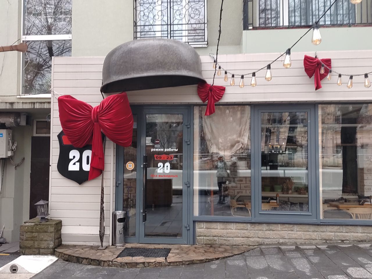 На улице Яворницкого вход в ресторан украшает огромный бархатный бант красного цвета. Кажется, что на его фоне селфи будут смотреться особенно удачно.
