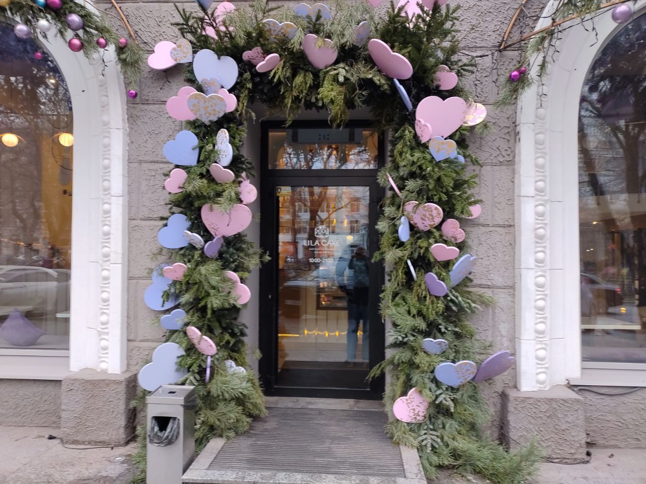 Вход в кафе-кондитерскую на центральном проспекте украшают несколько десятков сердечек в нежных тонах: от бледно-голубого до розового и серебристого.