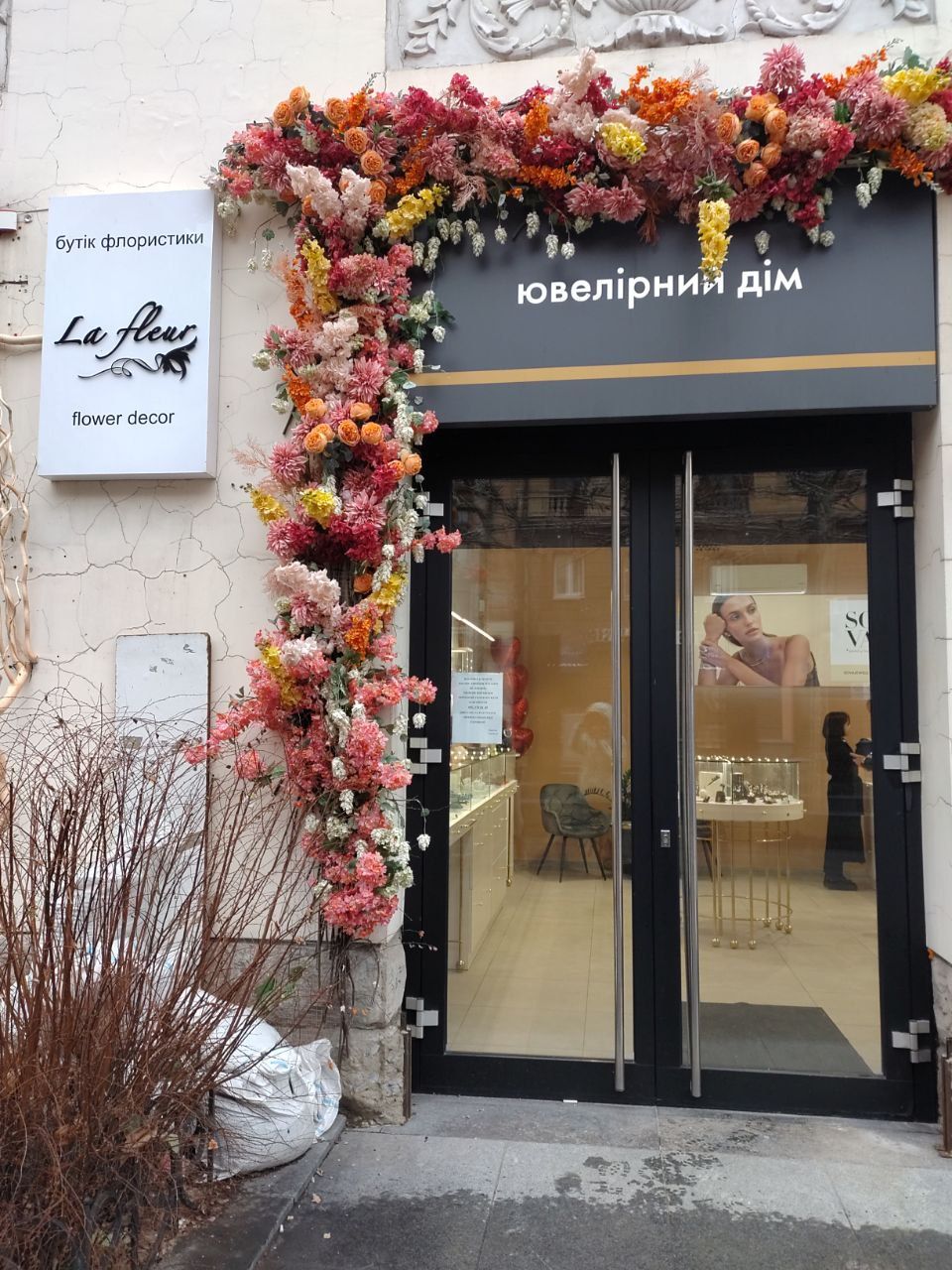 На улице Короленко возле входа в ювелирный магазин появился декор в виде цветов. Выглядит очень интересно.