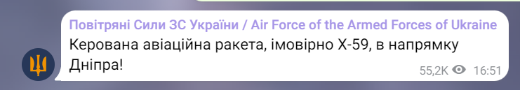 В 16:35 в Днепропетровской области объявили тревогу. Позже в Воздушных силах сообщили, что на Днепр враг направил ракету.