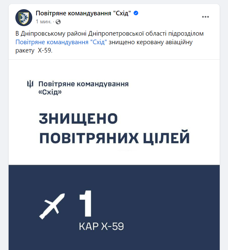 В Днепровском районе Днепропетровской области подразделением Воздушного командования "Схід" уничтожена управляемая авиационная ракета Х-59, - говорится в сообщении.