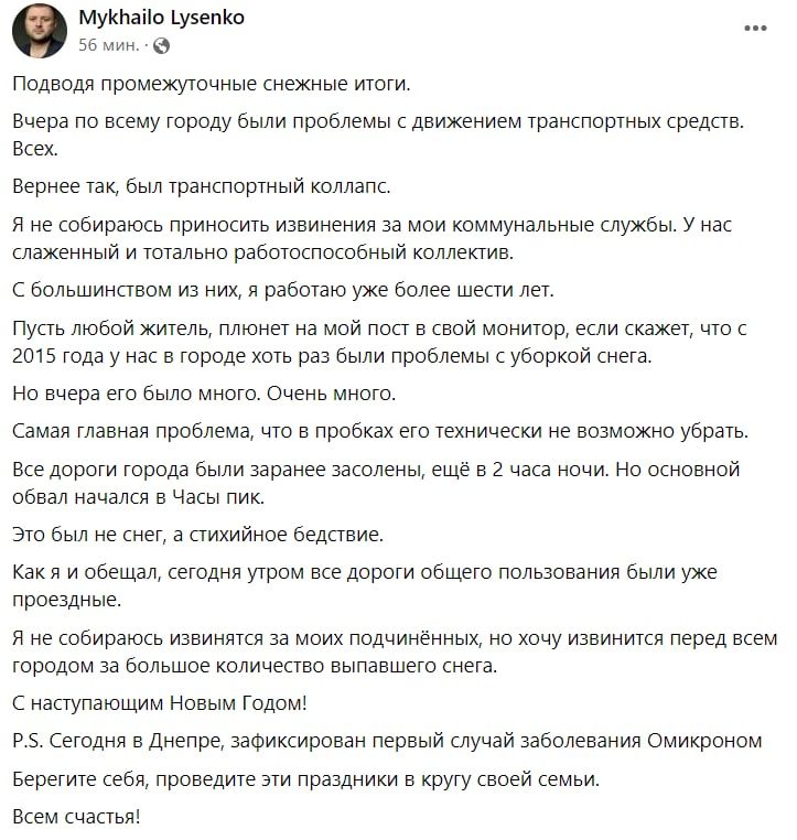 Я не собираюсь извиняться за моих подчинённых, но хочу извиниться перед всем городом за большое количество выпавшего снега. С наступающим Новым Годом!» - написал он в ФБ.