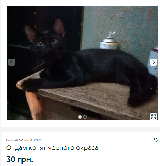 Те, кто не хочет или не может завести черного породистого кота не останутся без «угольного» питомца. В Днепре за 30 грн отдают гладкошерстных домашних котов черного цвета. Все, что о них известно – усатым исполнилось три месяца. Любить своего хозяина они будут так же, а может и лучше, как и дорогие породистые хвостатые.