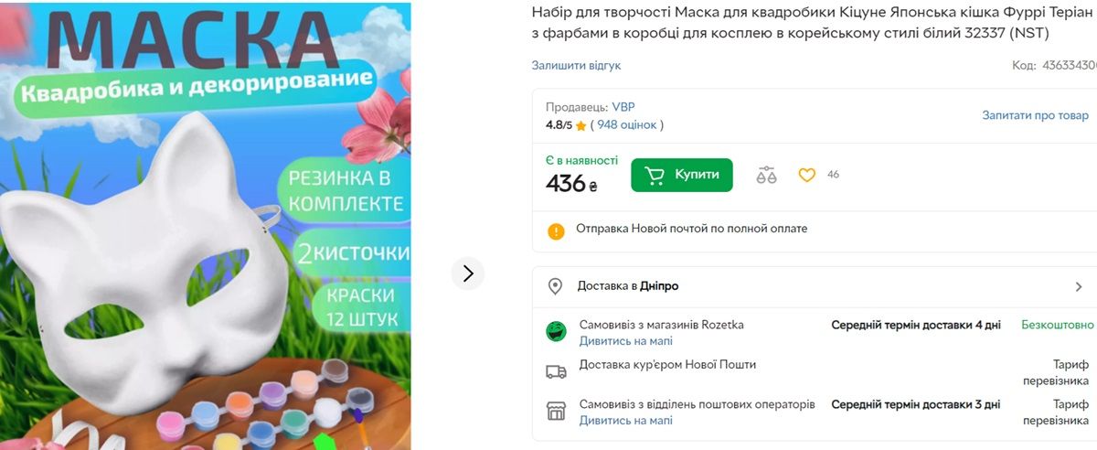 За набор для творчества, где можно самостоятельно разрисовать маску, с самой маской, красками и инструкцией необходимо отдать 436 грн.