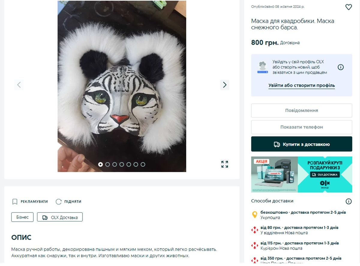 Разрисованная маска под животное, отороченная искусственным мехом, с необходимыми резинками обойдется в 10 раз дороже – 800 грн. Маска сделана на заказ, а мех можно расчесывать и придавать ему форму.