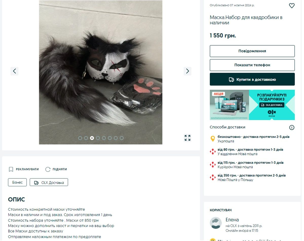 Набор для квадробики, состоящий из маски, хвоста и лапок обойдется в 1550 грн. Набор аксессуаров имитирующий любое животное можно заказать. Его сделают вручную за 1 день.