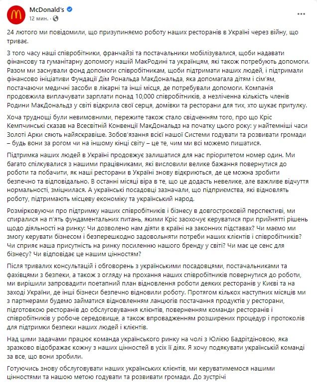 Рестораны сети заработают в Киеве и на Западе Украины в течение нескольких следующих месяцев. Отмечается, что решение в McDonald's приняли после длительных консультаций и обсуждений с украинскими чиновниками, поставщиками и специалистами по безопасности, а также по просьбе сотрудников вернуться к работе.
